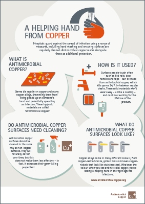 Copper Alliance has produced a simple guide to Antimicrobial Copper for patients to explain what it does, what it looks like and how it works as a supplement to standard practices, not as a substitute. The poster can be used for Patient Focus Groups and in a hospital where copper has been installed. Click the link below to download a copy.